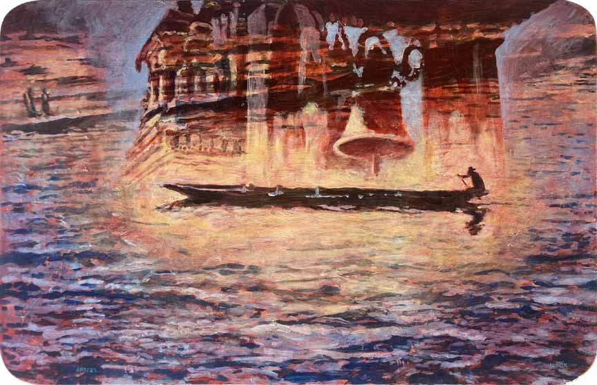 Chitwan boatman with Bhaktipur temple bell 5/16/23, 18” x 28", acrylic on board. |
